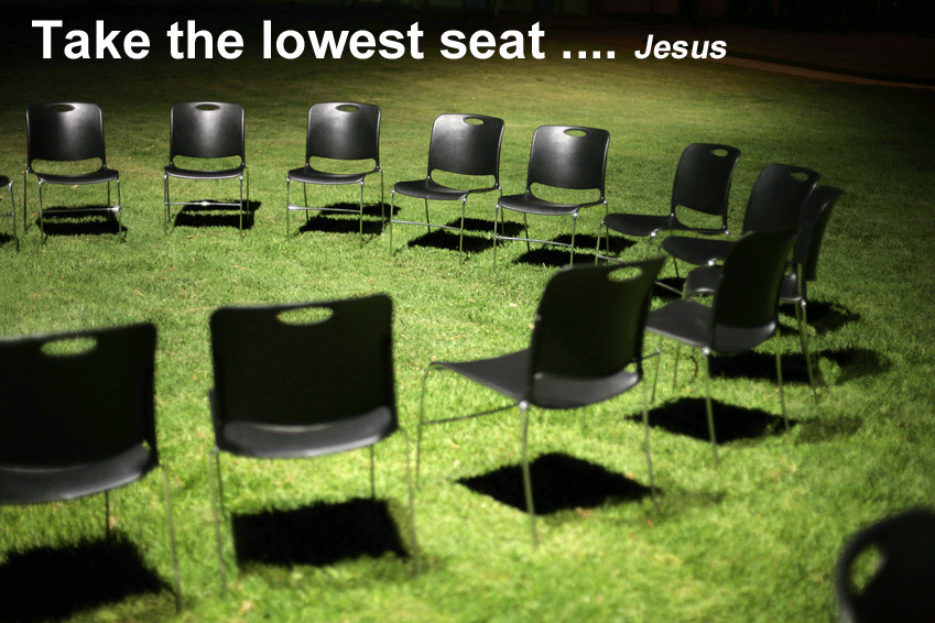 When he noticed how the guests chose the places of honour, he told them a parable. ‘When you are invited by someone to a wedding banquet, do not sit down at the place of honour, in case someone more distinguished than you has been invited by your host; and the host who invited both of you may come and say to you, “Give this person your place,” and then in disgrace you would start to take the lowest place. But when you are invited, go and sit down at the lowest place, so that when your host comes, he may say to you, “Friend, move up higher”; then you will be honoured in the presence of all who sit at the table with you. For all who exalt themselves will be humbled, and those who humble themselves will be exalted.’